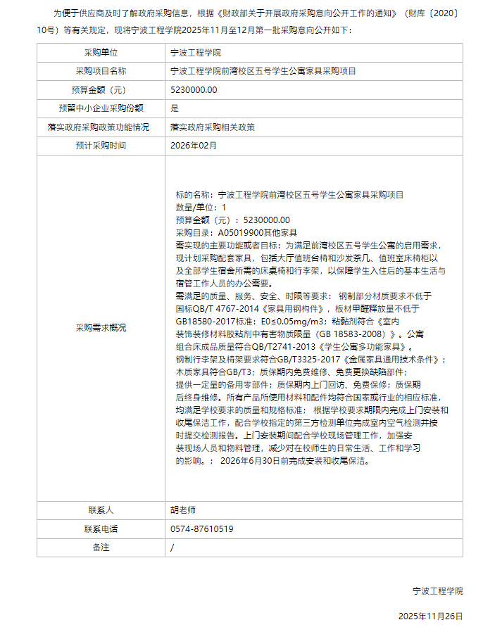 宁波工程学院前湾校区五号学生公寓家具采购项目